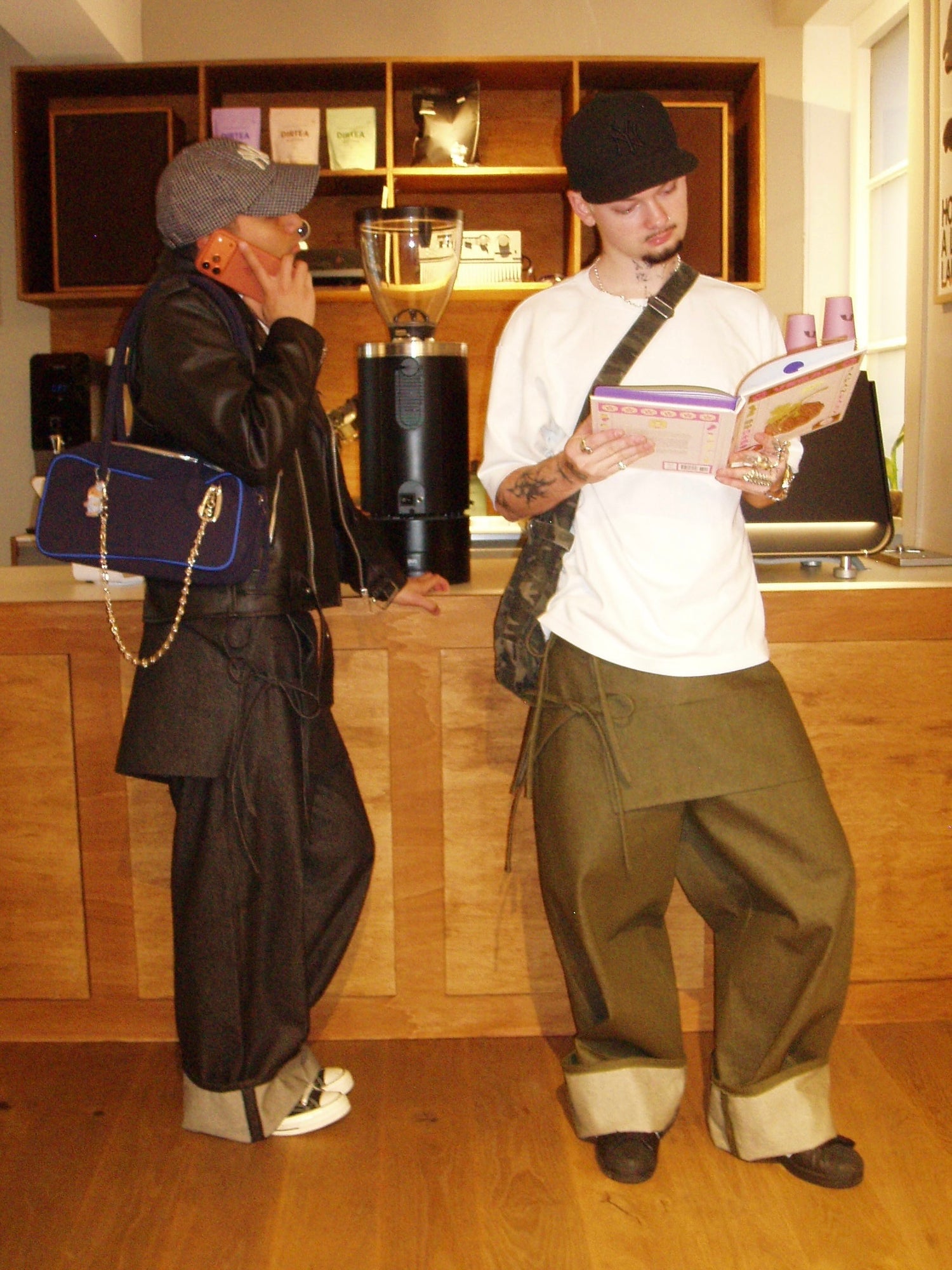 two-tie apron trousers in charcoal and new khaki colour-way available for pre-order on the 30th of october at 6pm london time.