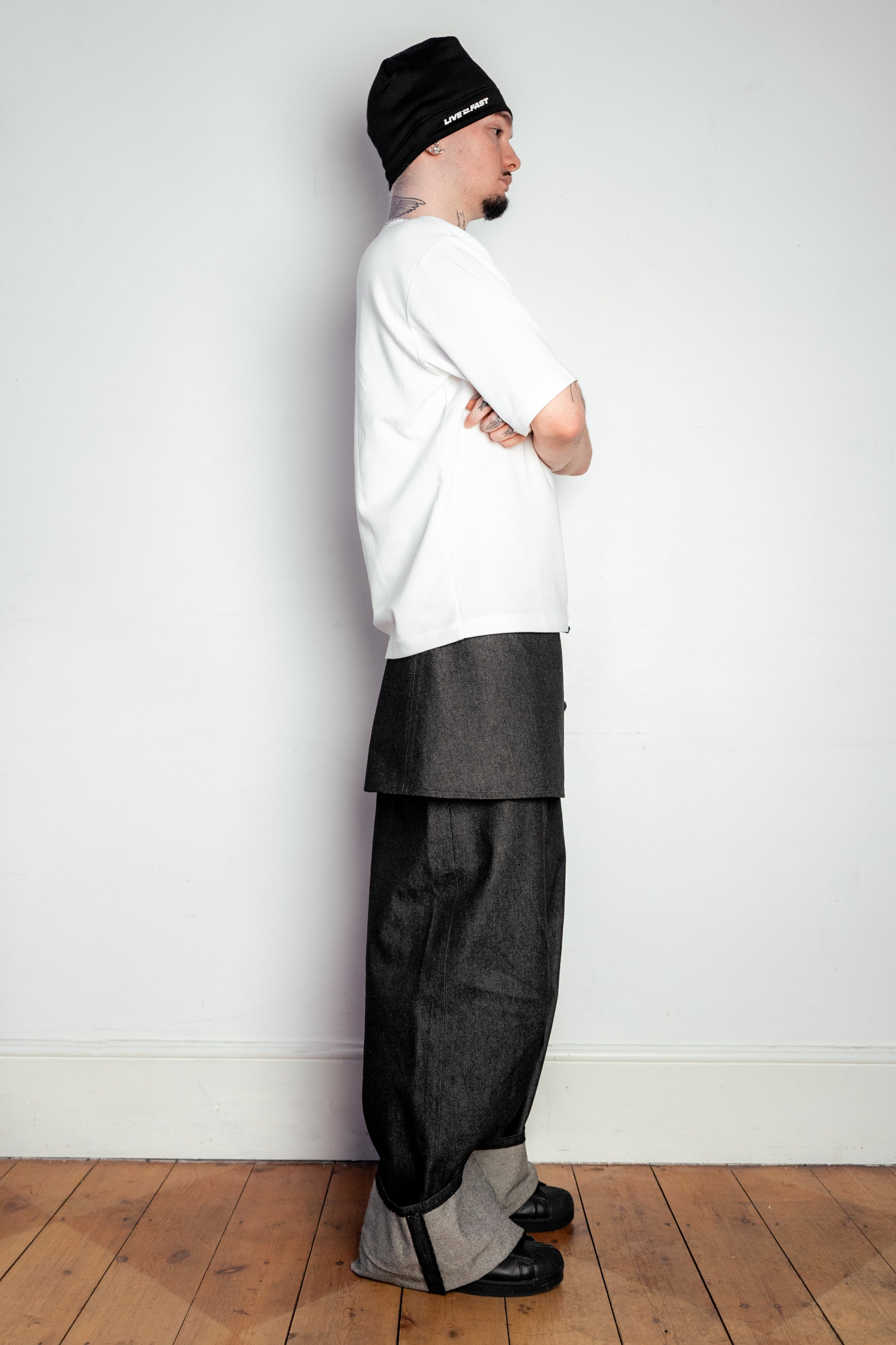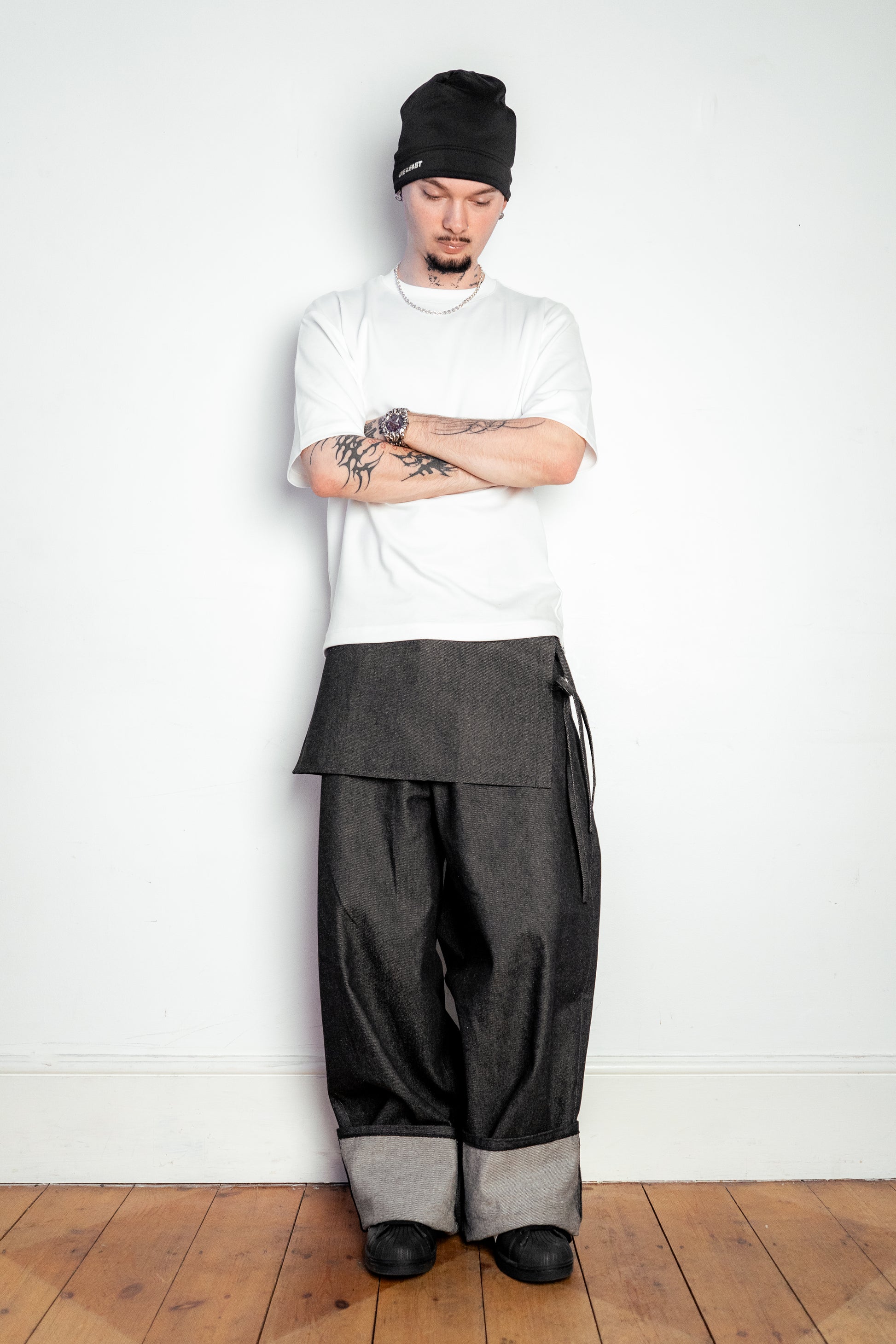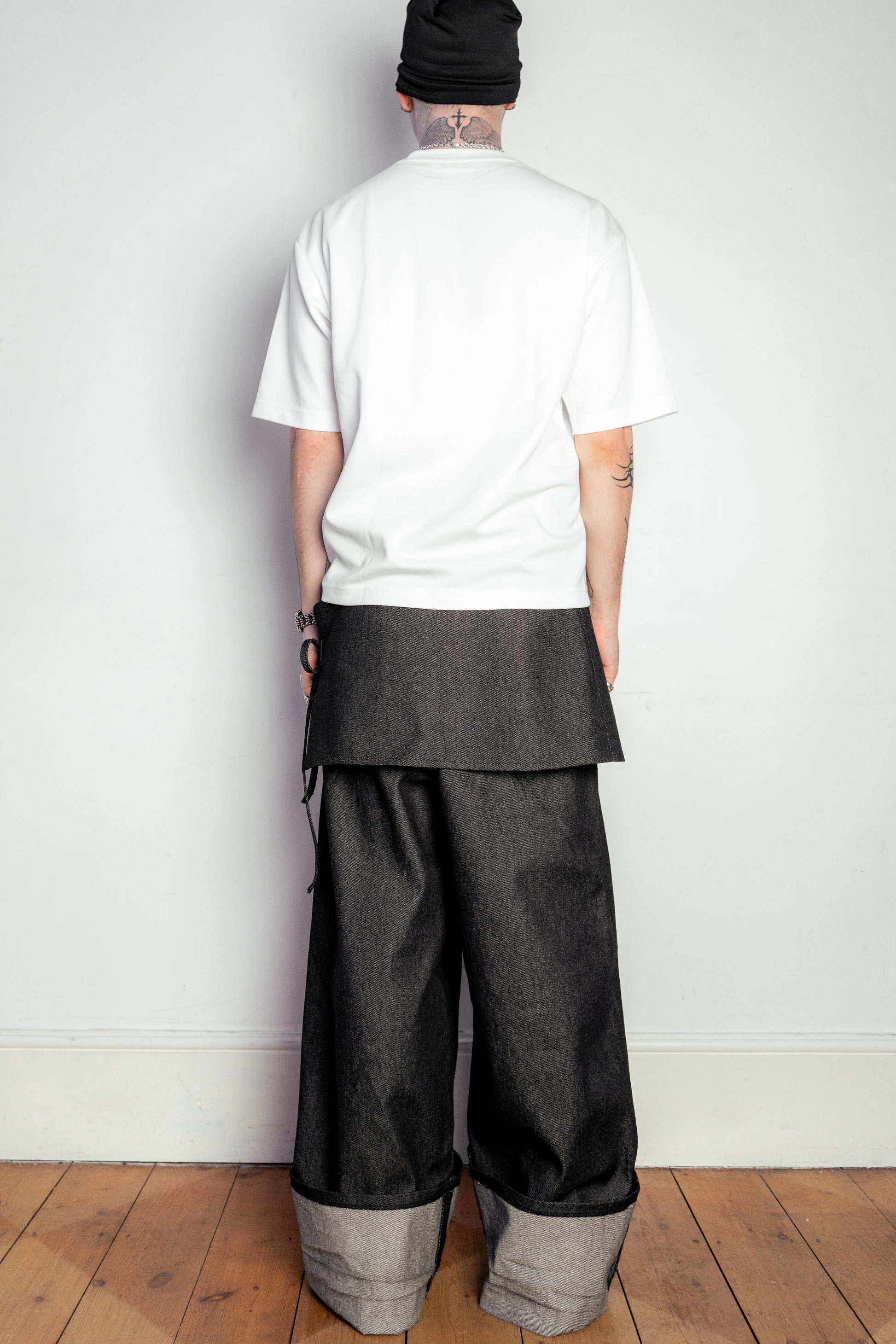 A denim set featuring a pair of mid-low rise relaxed trousers and a tied wrap apron. Made from a mid-weight 100% cotton dead-stock denim in a charcoal colour.